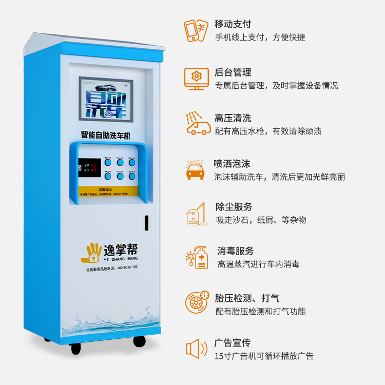 逸掌幫除了具有強大的自主洗車盈利能力外,還具有戶外廣告機的功能,可承接廣告與商家合作、保險、旅游賺廣告費,獲利方式多樣。