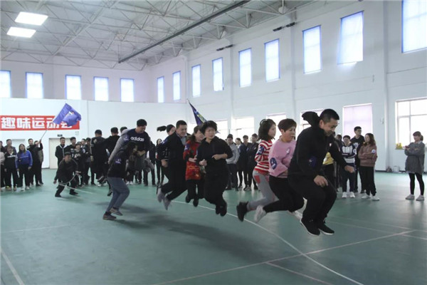 此次“袋鼠跳”全程往返為20米,以麻袋為道具。比賽規(guī)則是,隊員們排好隊,站在起跑線上,聽到發(fā)令后,進入麻袋,并向前跳躍,然后到了折返點后再跳回來,第二人接力,以此類推,直至4人全部完成,用時最短隊伍名次列前。